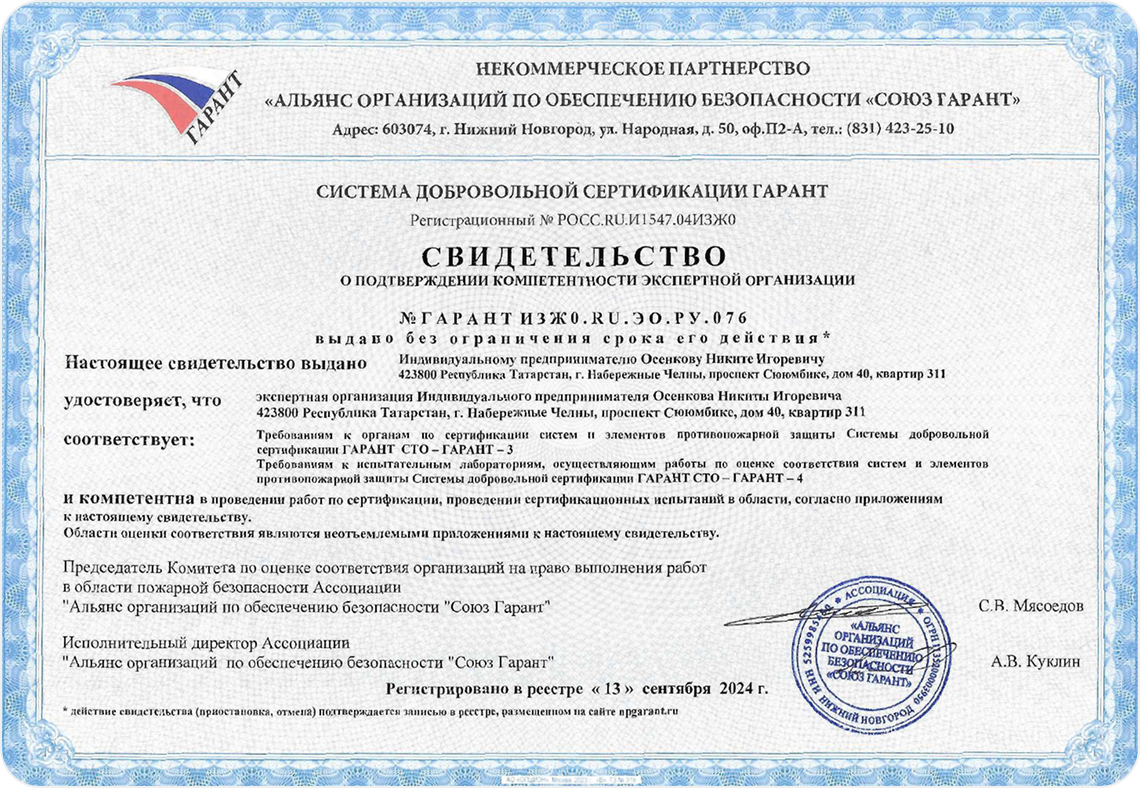 Свидетельство о подтверждении компетентности экспертной организации ИП Осенков Н.И